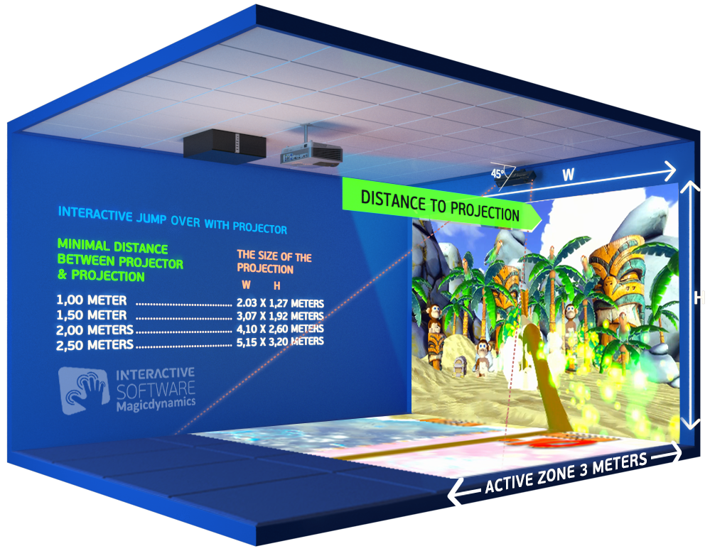 Интерактивная стена «Перепрыгни» -динамичная проекция на стене и полу, красочная игровая сцена, где игроки могут видеть приближающиеся опасности, персонажей или визуальные подсказки на стене. В то же время на проекции на полу появляются препятствия и задания, через которые игроки должны перепрыгивать, избегать или реагировать в реальном времени.