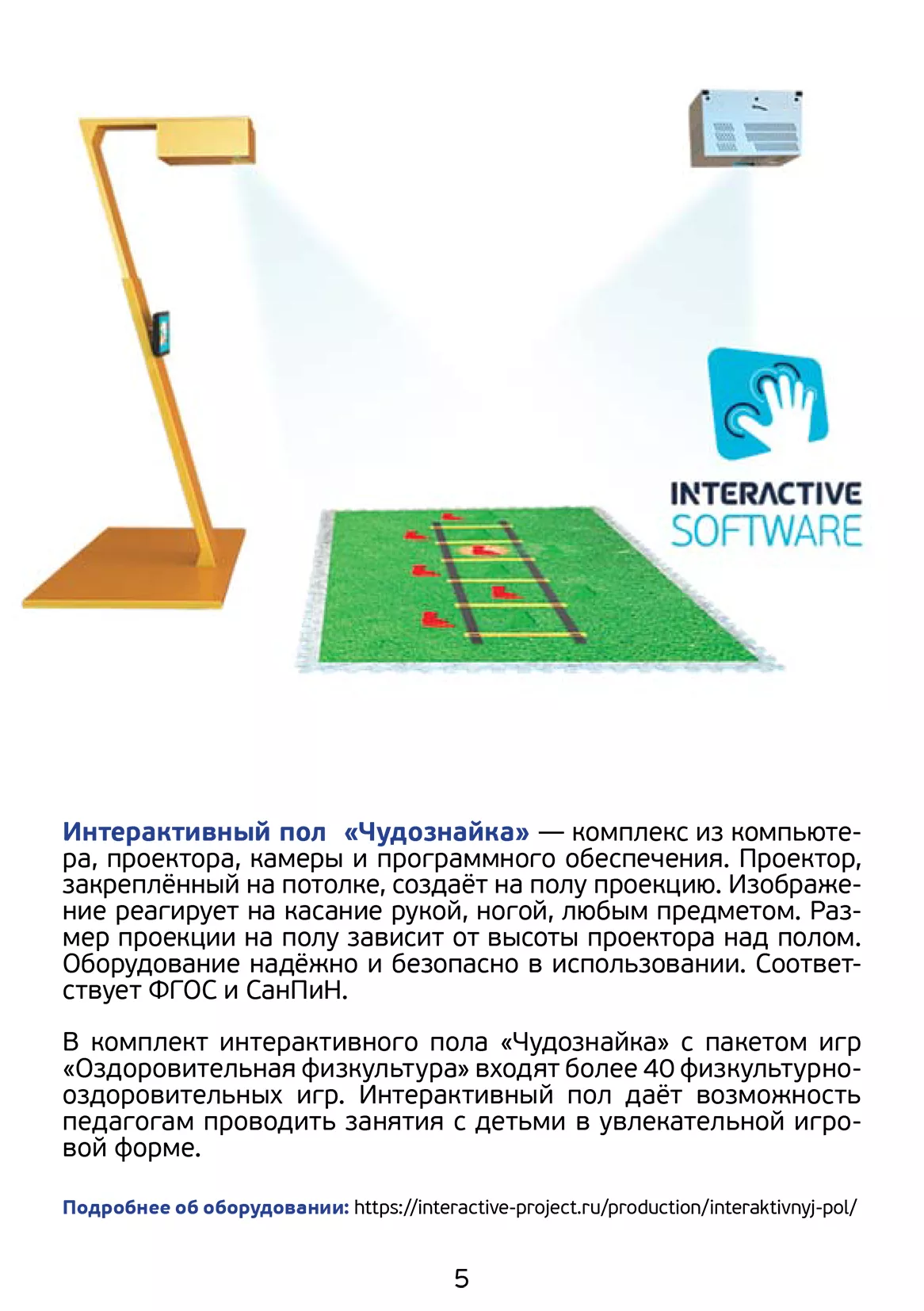 Интерактивный комплекс «Оздоровительная физкультура» — инновационное оборудование для проведения занятий с детьми с элементами ЛФК. Проекционная система монтируется на потолке и создает интерактивное изображение на полу, что делает занятия физкультурой более увлекательными и эффективными.